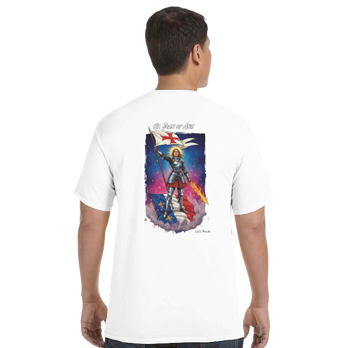 Celebrate the fiery courage of Saint Joan of Arc — the young maiden who answered heaven's call with a warrior's heart. This design captures her unwavering conviction and divine mission to lead a nation to victory. It reminds us that God chooses the unlikely to accomplish the impossible.